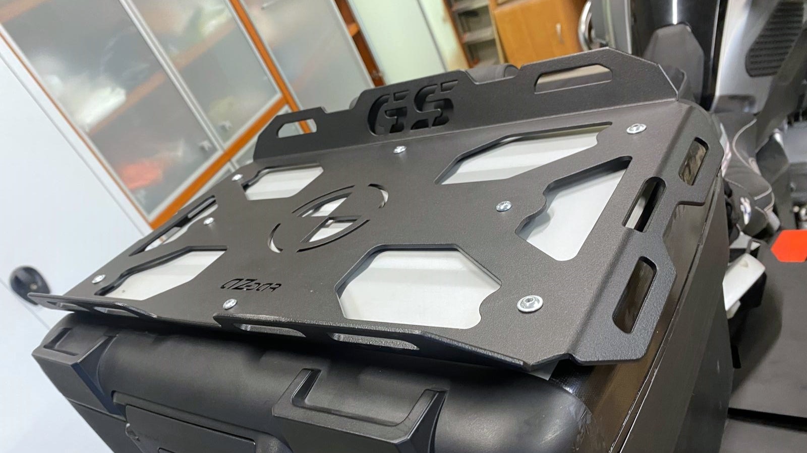 Bagażnik motocyklowy do zamontowania na kufrze Vario mocowany jest do kufra za pomocą śrub nierdzewnych i regulowanych dystansów gumowych, dzięki czemu możemy go idealnie dopasować do oryginału